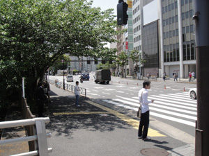 橋を渡り、横断歩道を渡らずに左に進みます。写真中央のビル手前にある信号を渡り、写真中央のビルの右側の道をまっすぐ進みます。